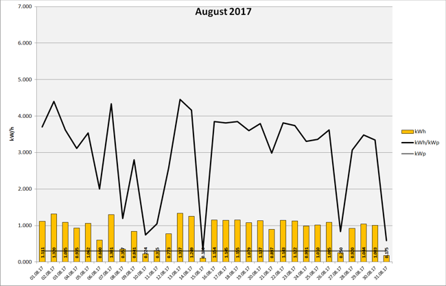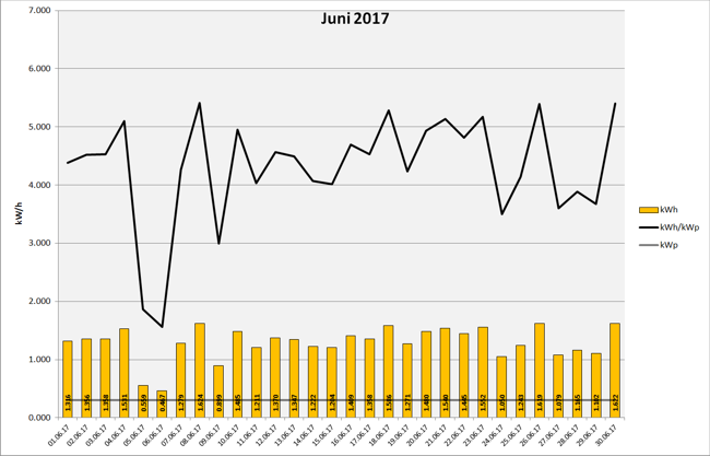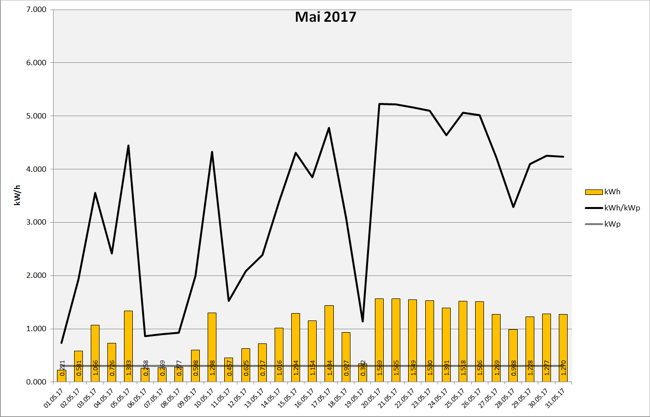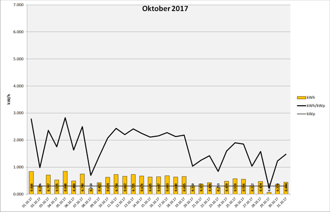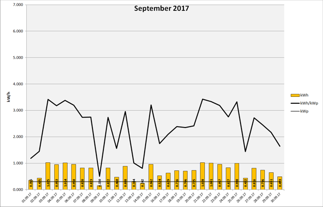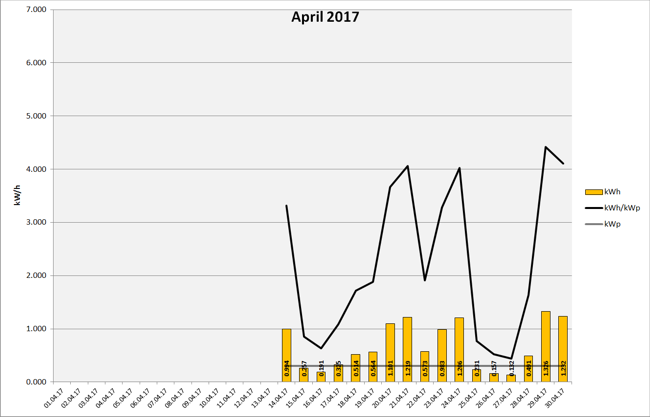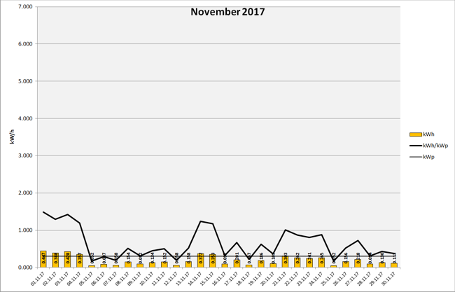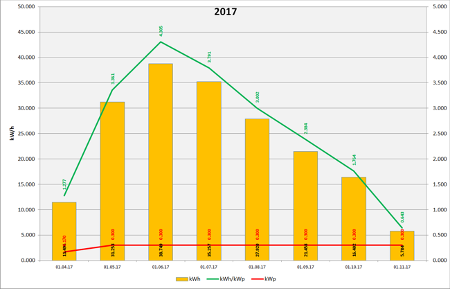 Anlagenleistung: 0.300 kWp Amortisation: █████ █████ █████ █████ █████ █████ █████ █████ █████ █████ 7% Stand: 01.12.2017 23:59:59 - Laufzeit: 231 Tage - Total Produktion: 188,460 kWh Ertragsdaten: 2017-11 2017-10 2017-09 2017-08 2017-07 2017-06 2017-05 2017-04